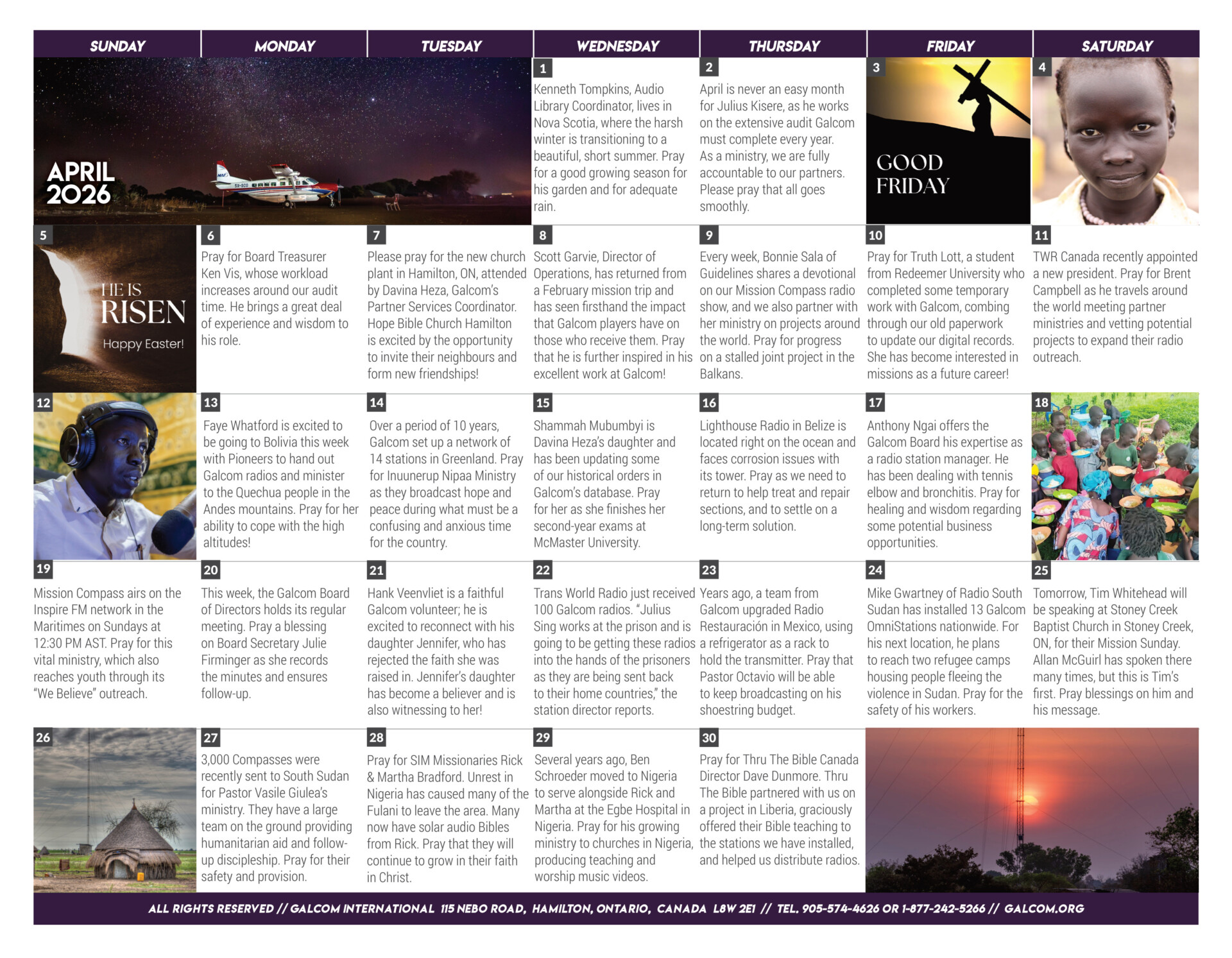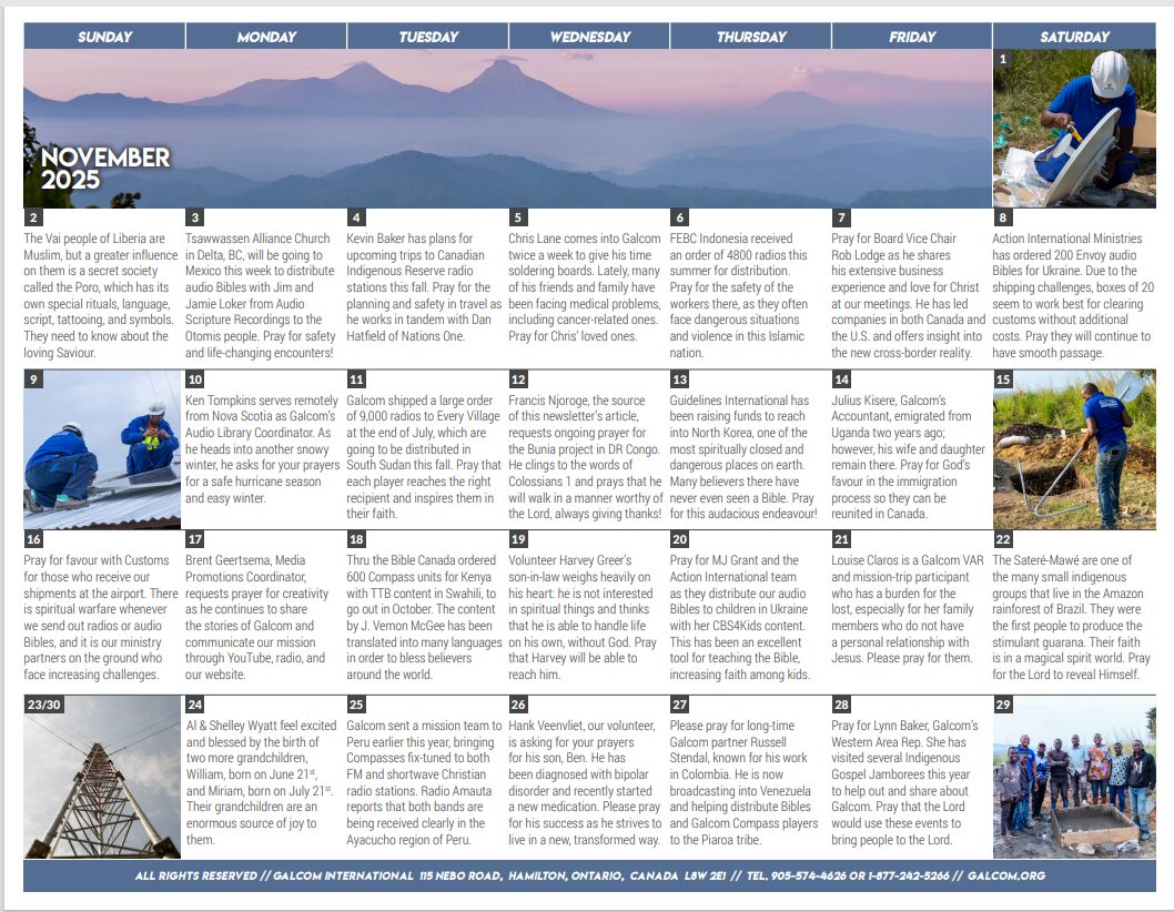 Prayer is essential to this ministry! Galcom International’s Prayer Calendar is sent out four times a year. With prayer being our foundation, we fill it with requests for our partners, volunteers, staff and projects.